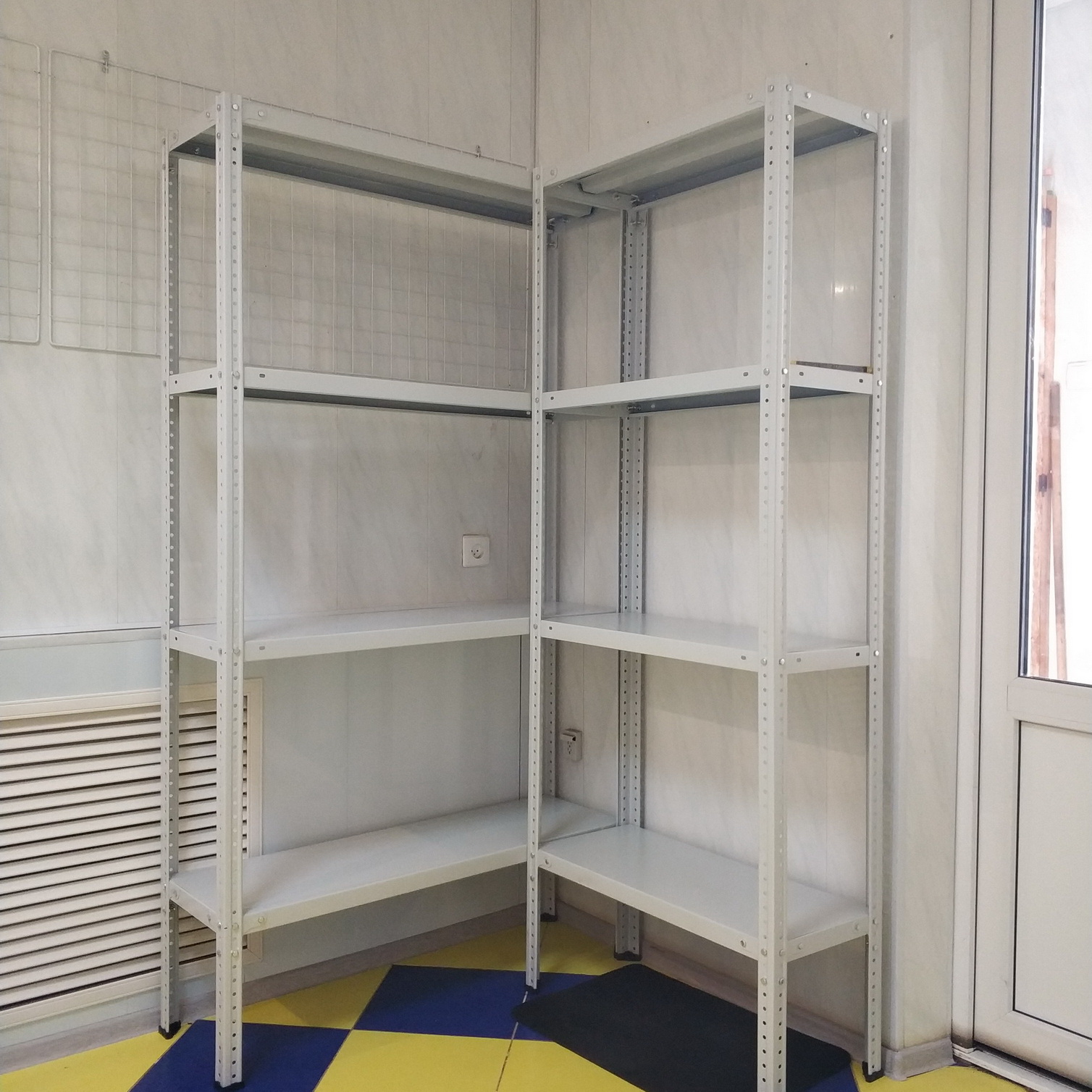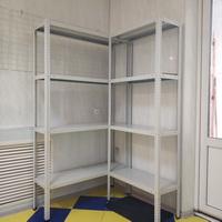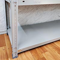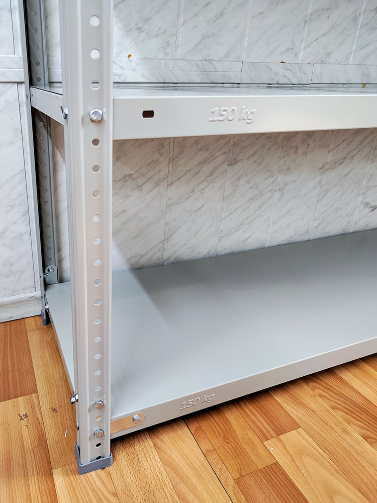 Комплект стеллажа комплектуется пластиковыми подпятниками и уголками жесткости только для крайних полок (верхняя и нижняя).
